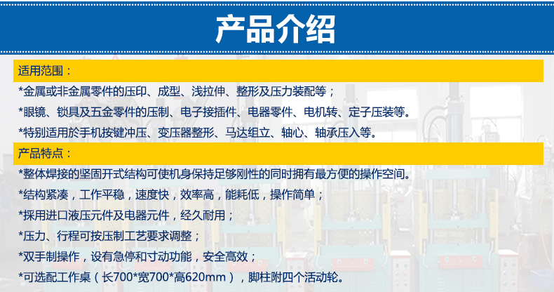 本设备适用于各种材料的冲孔,压印,整形,铆接.弯曲,剪切,拉伸,各种小型零部件的压装、装配.是一种多用途压床。