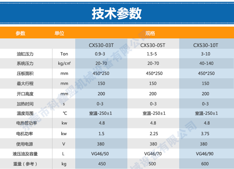 科鑫盟CX530系列油压热压机,液压热压机采用四柱三板式结构,上下模板增加发热装置和进口智能温控器,液压系统内置油箱底部,外观整洁,稳重. 工作台下方装有脚轮和脚杯,可轻便移动。
