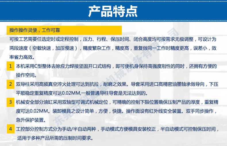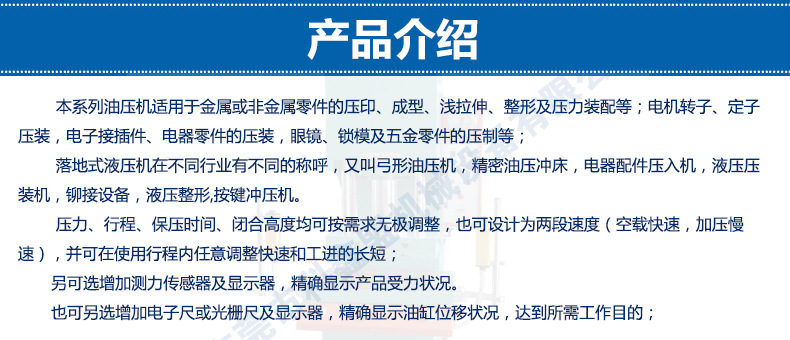 本系列油压机适用于金属或非金属零件的压印、成型、浅拉伸、整形及压力装配等;